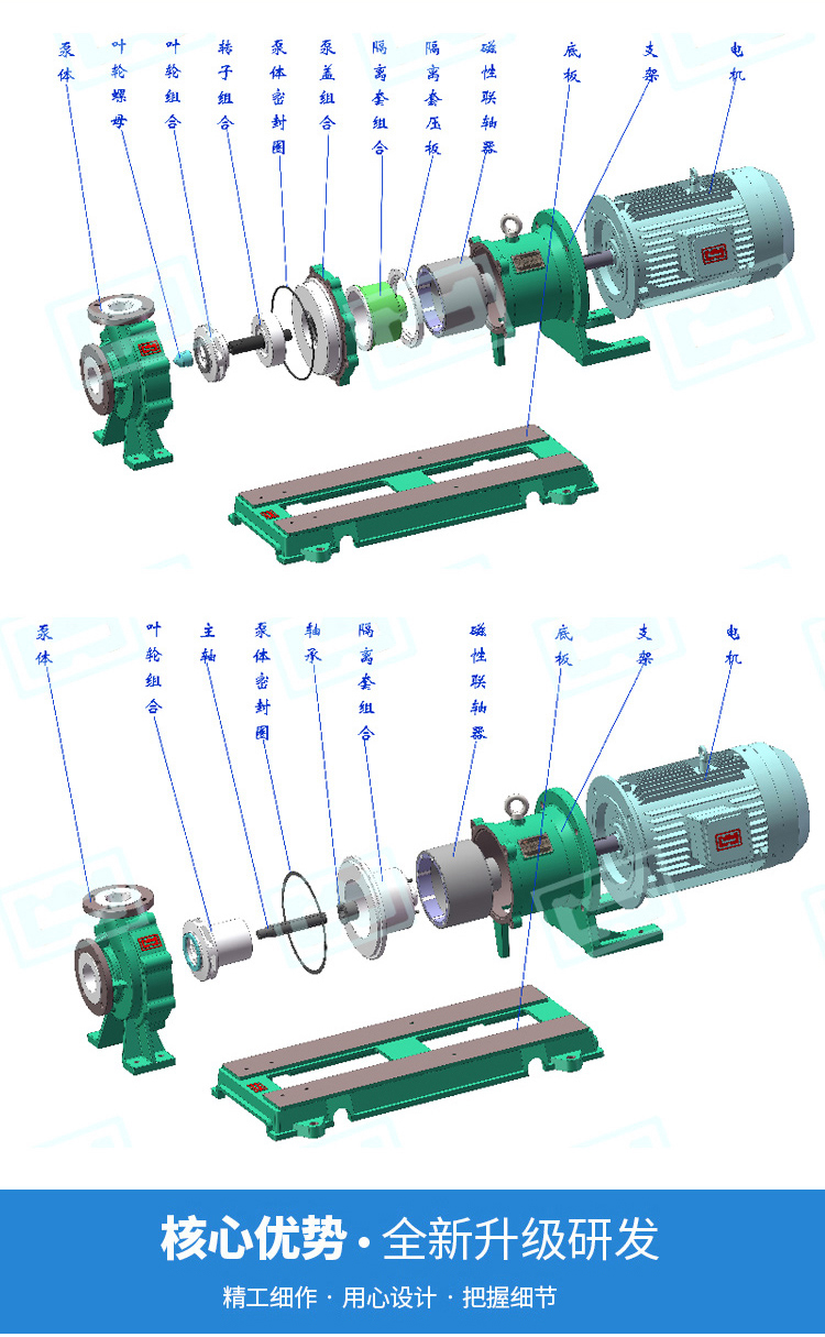 IMD系列磁力驱动泵,取消了轴封,利用磁力偶合间接传动,无滴漏的现象。