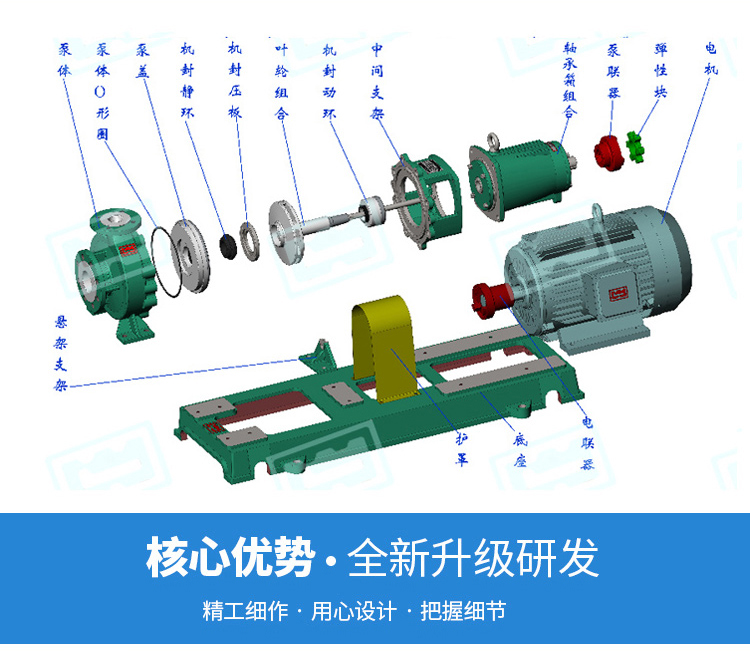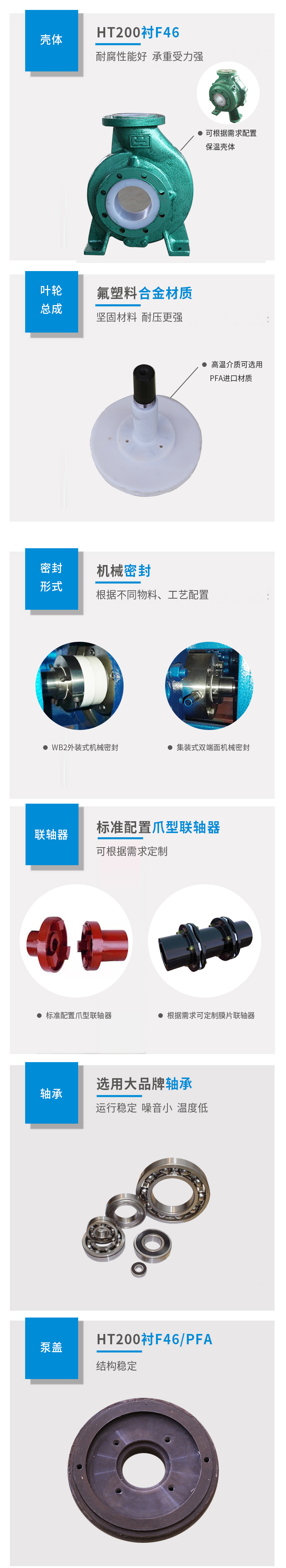 泵体和泵盖均采用金属(HT200)基体内衬氟塑料,叶轮采用金属嵌件(WCB)外包氟塑料合金压制成型。优点:耐腐蚀性范围广,强度高,经久耐用。